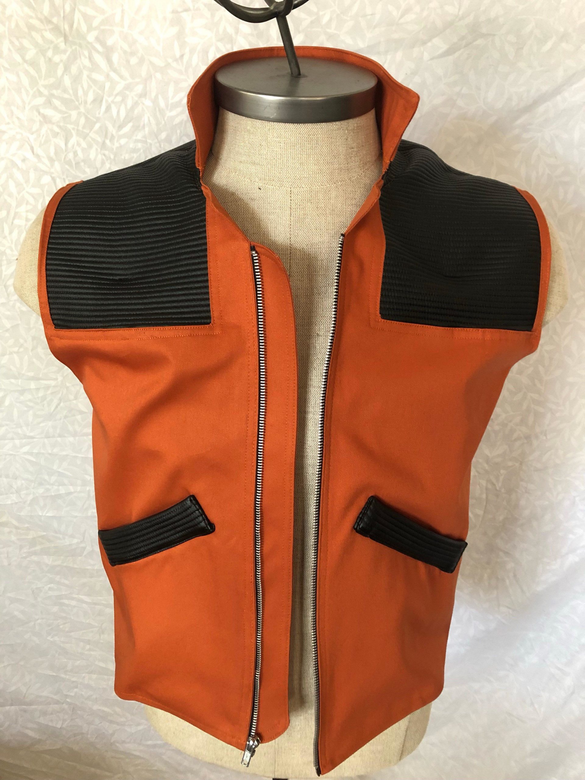 The monogrammed heathered vest is embroidered. Click to go to reviews. Gold zippers and snaps, 2 pockets in front, and a fitted band in the back adorn the vest.