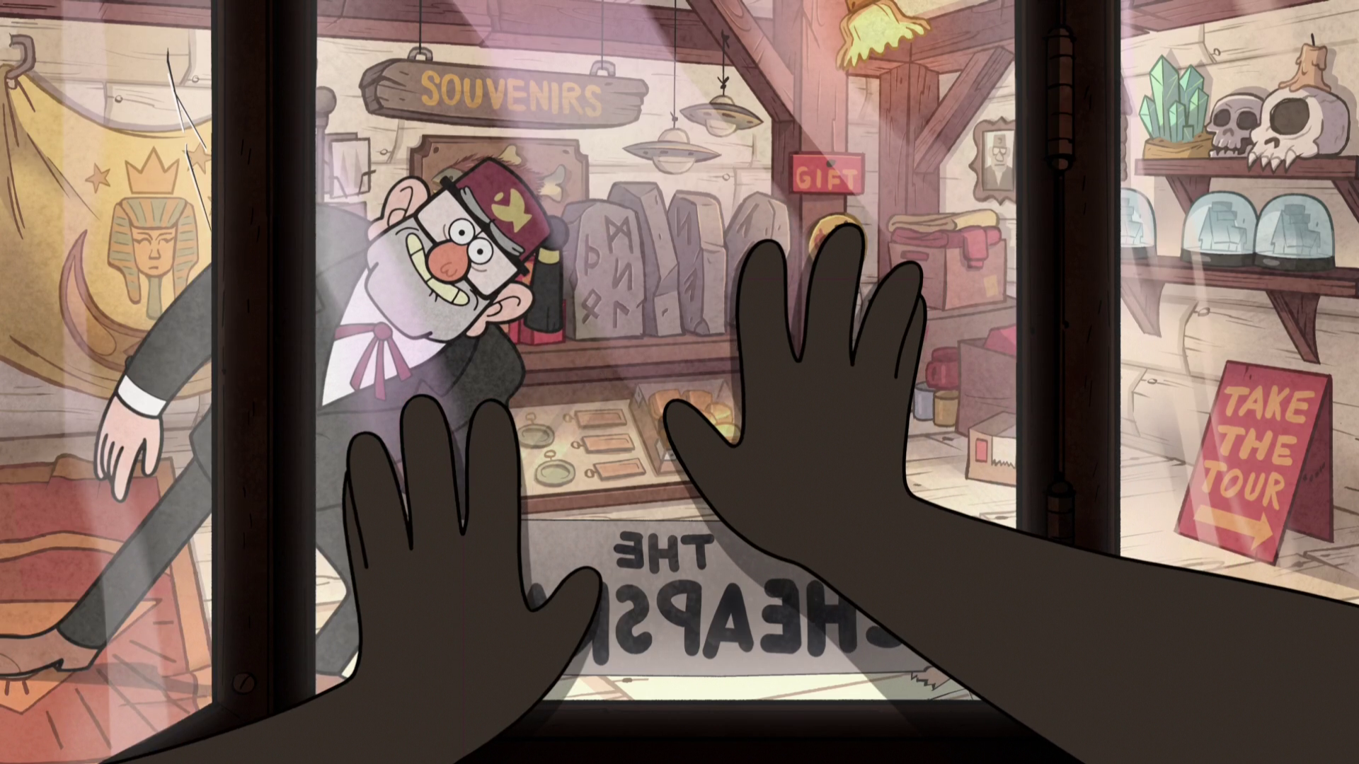 The next day, the viewer wakes up, as an attraction in the mystery shack that stan calls the cheapskate for not having bought any of the items he offered. Dipper and mabel had mentioned before that they'd met a time traveller at the cheapskate fair stan had hired, and then again at soos' birthday. Stan trying to sell merchandise to an unseen customer serves as one for the three stories.